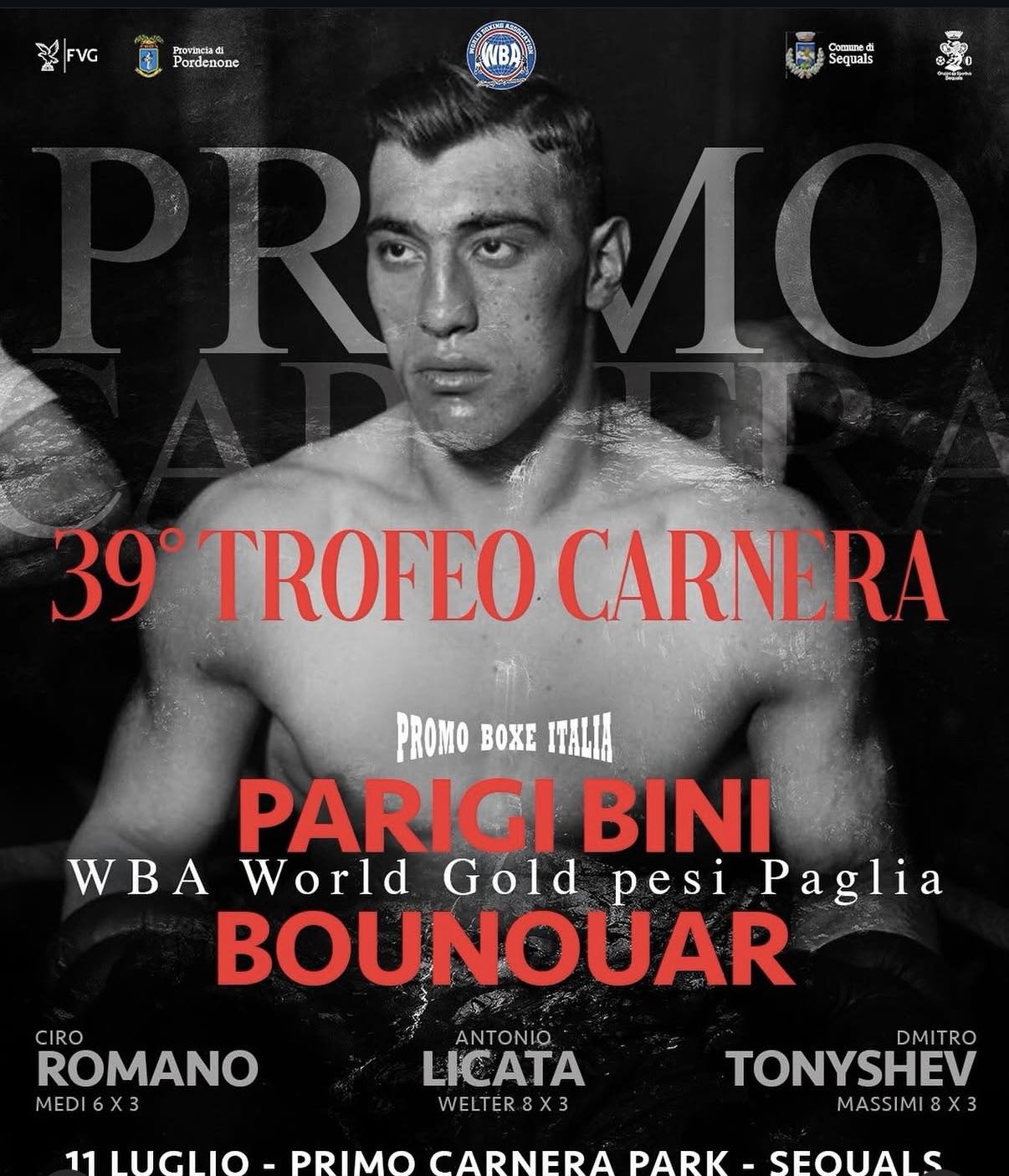 39° Trofeo Primo Carnera - il prossimo 11 luglio a Sequals la sfida WBA GOLD PAGLIA TRA LA PARIGI BINI E LA BOUNOUAR