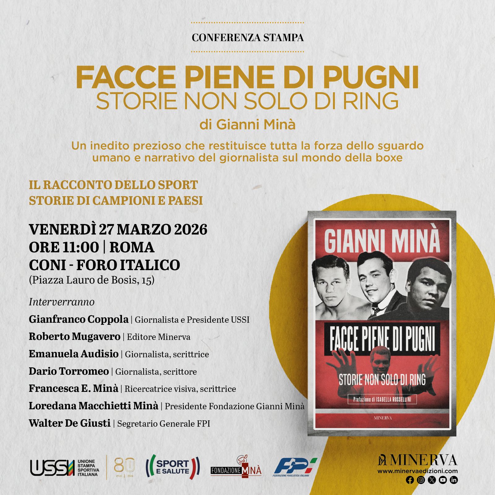 Bologna, 2 marzo 2026 - Un libro atteso quarant’anni. Un’opera rimasta incompiuta e oggi finalmente restituita ai lettori. Con Facce piene di pugni. Storie non solo di ring, Edizioni Minerva riporta in libreria un progetto editoriale di Gianni Minà che attraversa la storia del pugilato mondiale e, insieme, racconta un modo di fare giornalismo che oggi appare quasi irripetibile. Il volume sarà presentato per la prima volta venerdì 27 marzo 2026 alle ore 11:00 a Roma, presso il CONI – Foro Italico (Piazza Lauro de Bosis, 15), in occasione del terzo anniversario della scomparsa di Gianni Minà. L’incontro è organizzato insieme all’USSI – Unione Stampa Sportiva Italiana, che quest’anno celebra gli ottant’anni dalla sua fondazione e che fa del racconto dello sport il proprio impegno quotidiano. Interverranno Gianfranco Coppola (giornalista e Presidente USSI), Roberto Mugavero (Editore Minerva), Emanuela Audisio (giornalista, scrittrice), Dario Torromeo (giornalista, scrittore), Francesca E. Minà (ricercatrice visiva, scrittrice), Loredana Macchietti Minà (Presidente Fondazione Gianni Minà) e Walter De Giusti (Segretario Generale FPI).