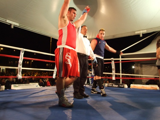 prendendo sin dall’inizio l’impronta del pugile vincitore Massimiliano Oberti (LB) batte ai punti (40-20) Alessio Cappuccio (LZ) nonostante il tifo concitato del pubblico di casa.