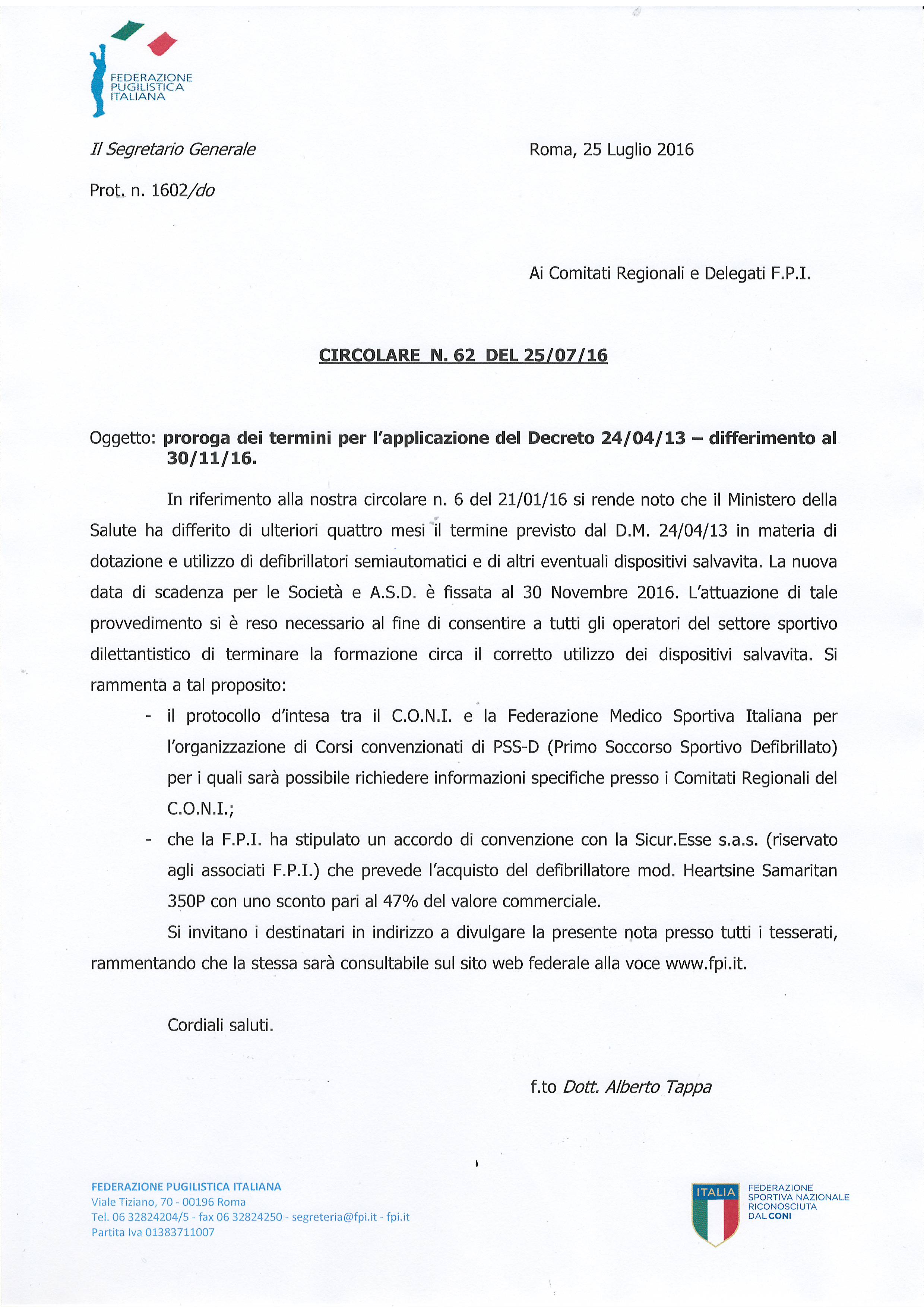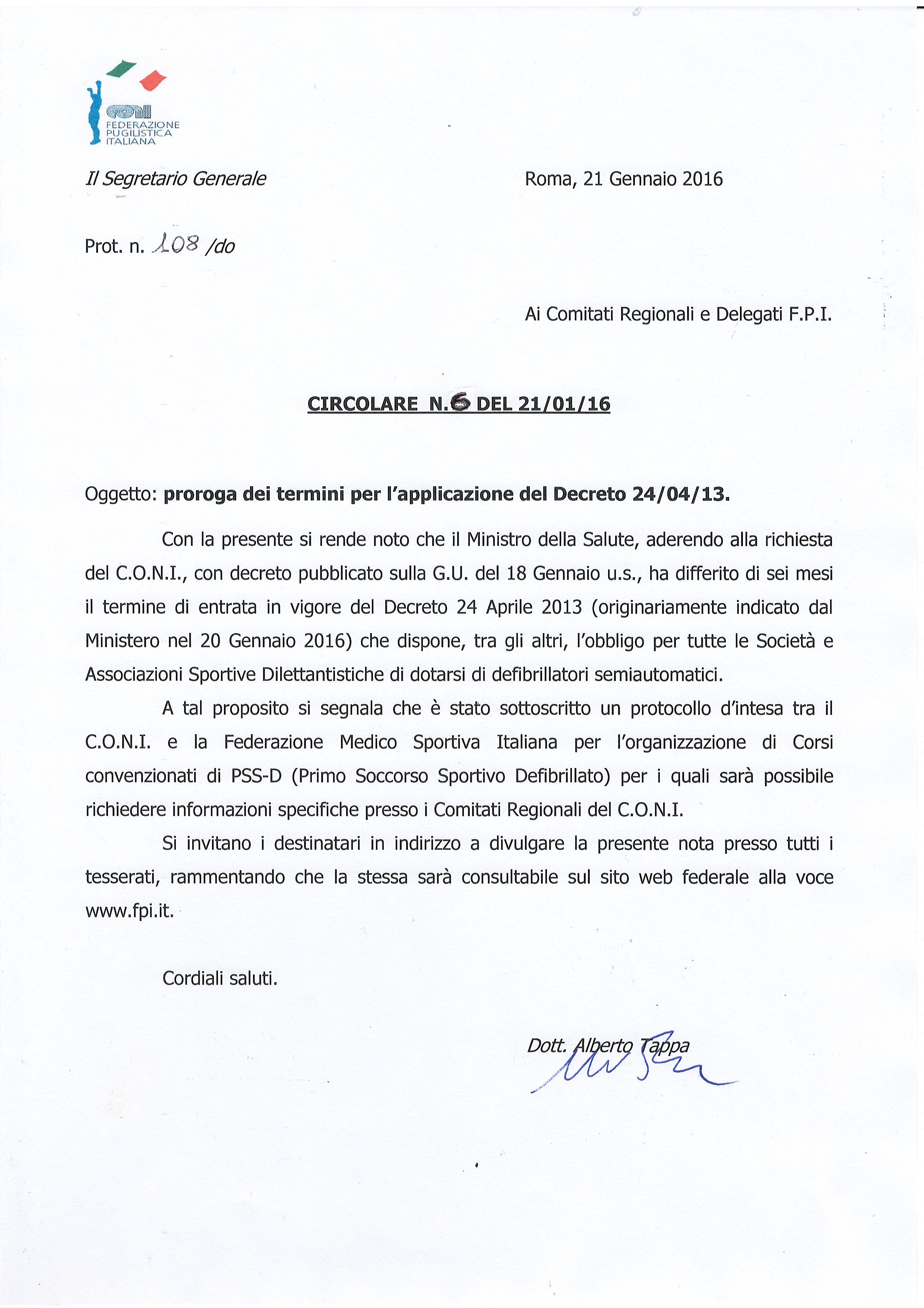 Circolare Sett. Sanitario n. 6 21/01/2016 - Proroga Termini Applicazione Decreto 24/04/2013